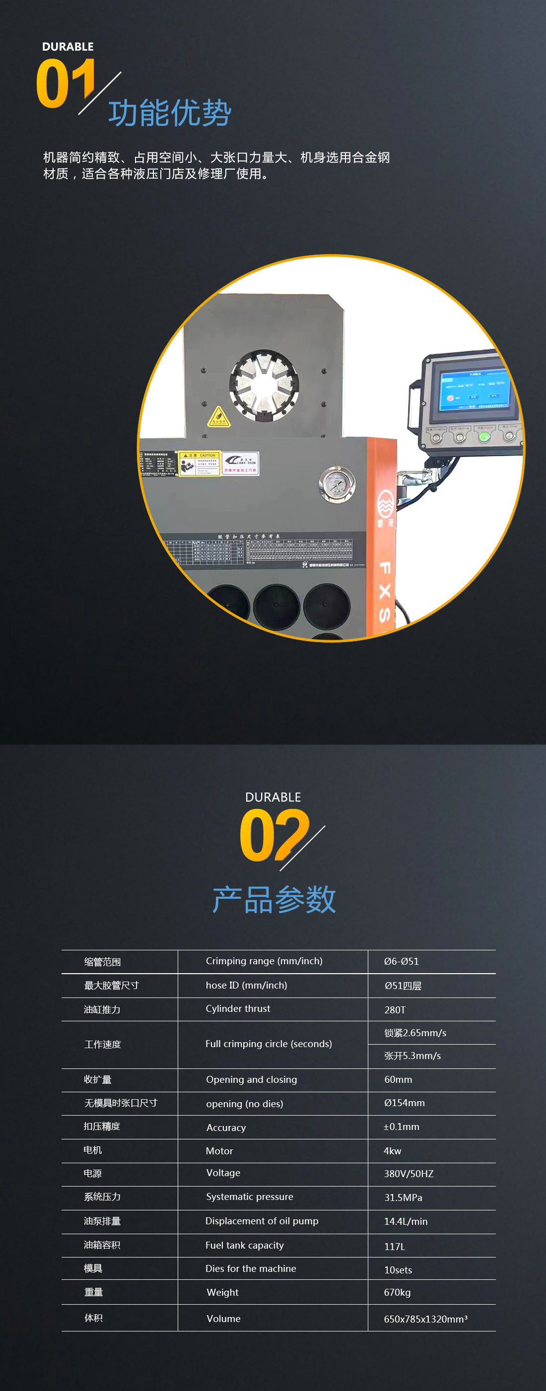 我公司新研發(fā)成功了超薄系列縮管機,扣壓重復精度可達到0.1mm。超薄的結構形式克服了傳統(tǒng)環(huán)形扣壓機固有的不足,能夠非常方便的扣壓形狀復雜的高壓油管總成和異型軟軸軟管。此款機器外觀尺寸更小,采用人性化設計,更方便使用者操作??刂葡到y(tǒng)采用的是PLC+觸摸屏模式,位移傳感器采集信號精度高,系統(tǒng)可采用手動、半自動和全自動三種模式,用戶可根據(jù)實際加工的工況非常方便的進行選擇,從而大大提高加工效率。在您使用的過程中如遇到有不方便之處請及時與我們聯(lián)系,我們將以不懈的努力提高您的產(chǎn)品質(zhì)量和工作效率。
