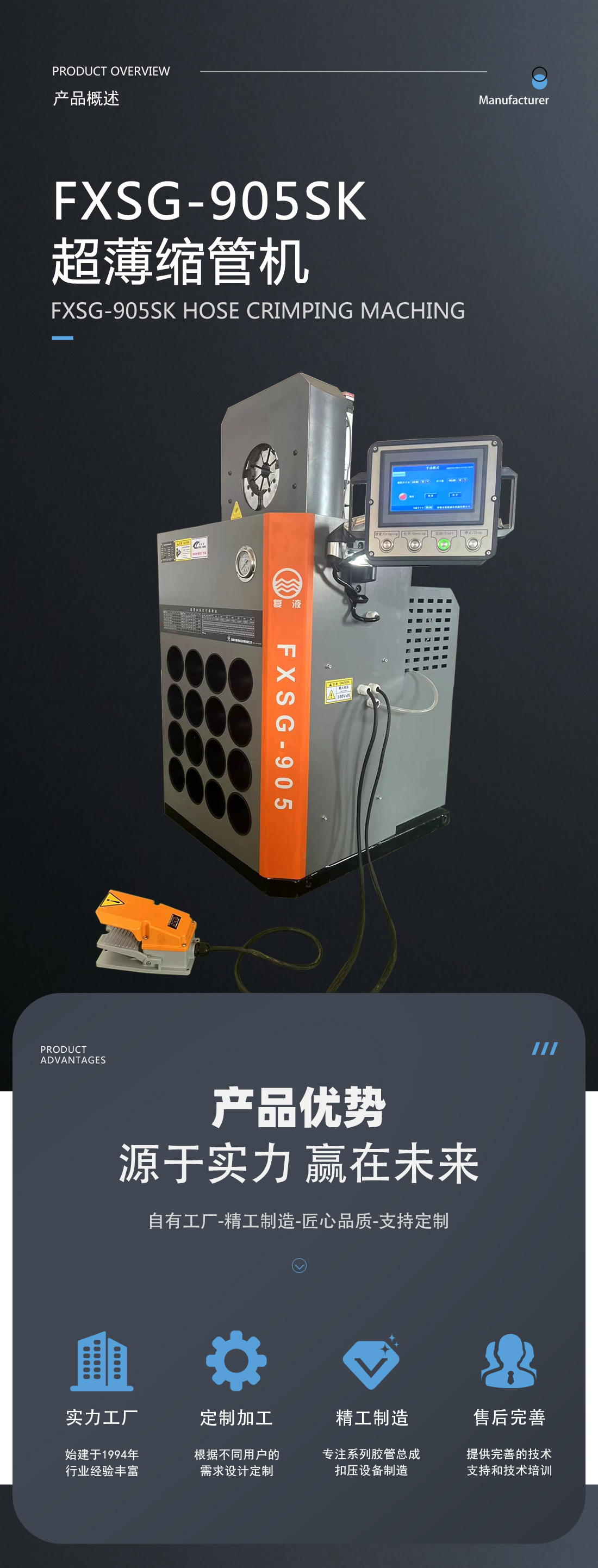 我公司新研發(fā)成功了超薄系列縮管機,扣壓重復精度可達到0.1mm。超薄的結構形式克服了傳統(tǒng)環(huán)形扣壓機固有的不足,能夠非常方便的扣壓形狀復雜的高壓油管總成和異型軟軸軟管。此款機器外觀尺寸更小,采用人性化設計,更方便使用者操作??刂葡到y(tǒng)采用的是PLC+觸摸屏模式,位移傳感器采集信號精度高,系統(tǒng)可采用手動、半自動和全自動三種模式,用戶可根據(jù)實際加工的工況非常方便的進行選擇,從而大大提高加工效率。在您使用的過程中如遇到有不方便之處請及時與我們聯(lián)系,我們將以不懈的努力提高您的產(chǎn)品質(zhì)量和工作效率。